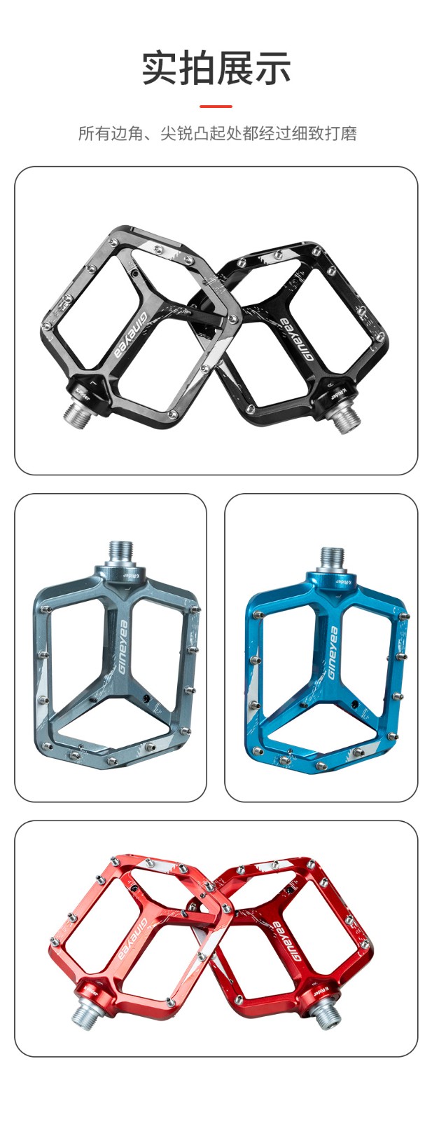 景晔新款C6系列外观设计比较个性化,造型设计相同,采用嵌套轴心的一个设计,所有边角尖锐凸起除都经过细致打磨,铝合金CNC本体,珞钼钢轴心,骑行更省力,采用大轴承+衬套的一个设计,尺寸分大中小,大号用于速降,中号用于CX,林道,泵道,小号用于童车