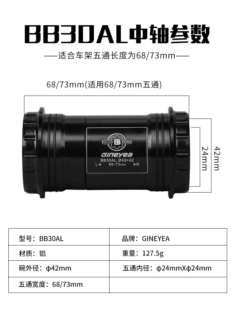 景晔山地自行车培林对锁中轴中空一体牙盘BB中轴压入式螺纹中轴